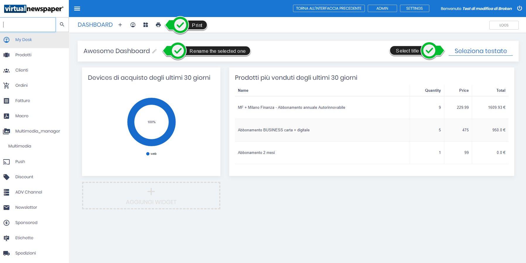 If you click on Dashboard List icon, you can see the list of your available dashboards. You can edit them and set the main dashboard. The main dashboard is the default dashboard showed after the log-in