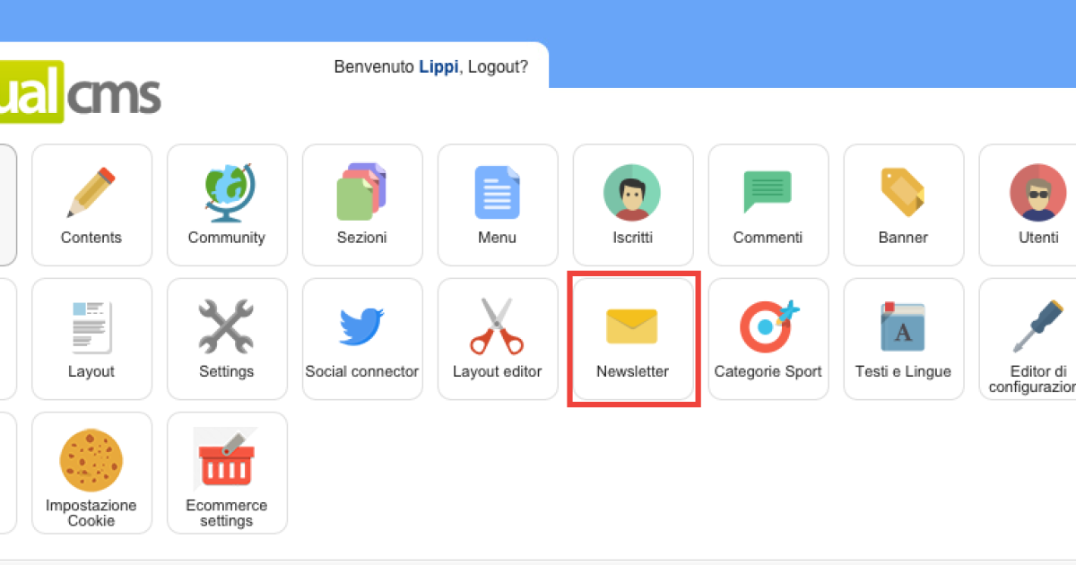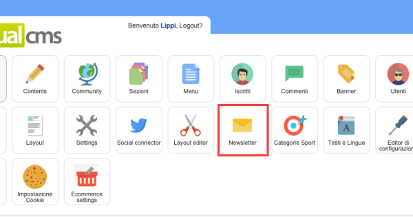 1. il menu a tendina permette di scegliere fra le sezioni disponibili quella che andrà a comporre con i suoi contenuti la newsletter.