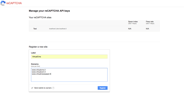 Visit https://www.google.com/recaptcha/admin (you must have a google account), configure all the domains of your site and click on Register