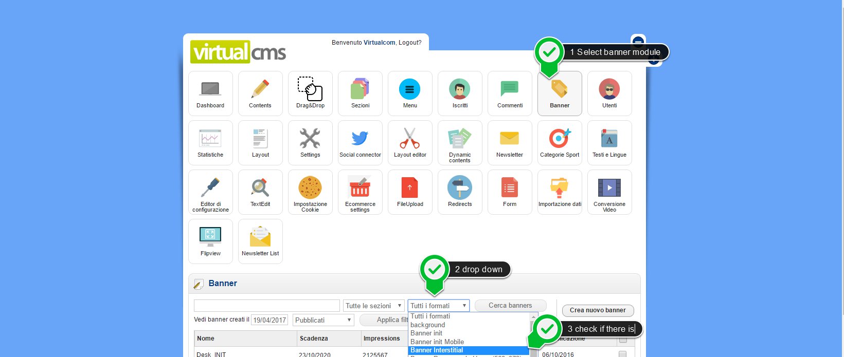 Normally the Interstitial ad is delivered by an ad server. Virtualcms give the chance to create and customize the Interstitial banner.