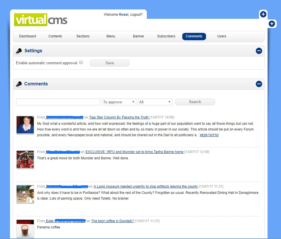 You can filter comments by channel and status of comments (To Approve, Approve and spam).
