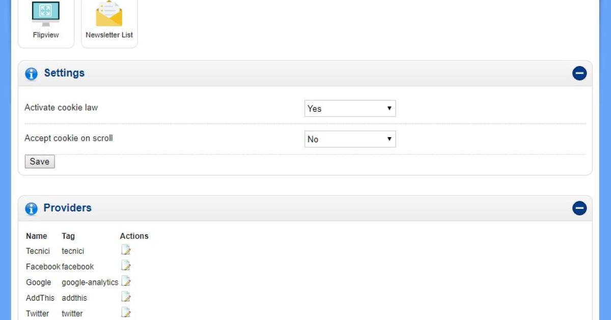 Per prima cosa, il modulo Cookies del cms, permette di attivare la Cookie Law per l'accettazione dei cookie del sito. In questa maniera quando un nuovo utente che si collega al sito per la prima volta, viene informato della cookies policy e gli viene richiesto di accettarne l'utilizzo.