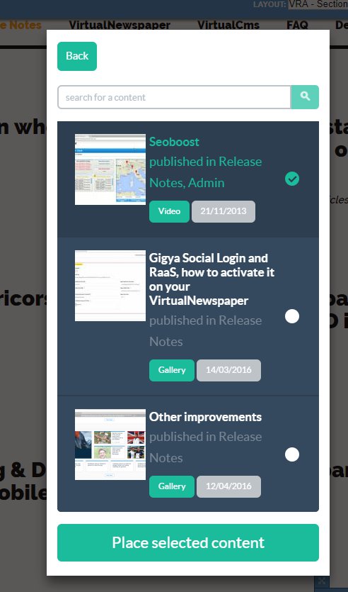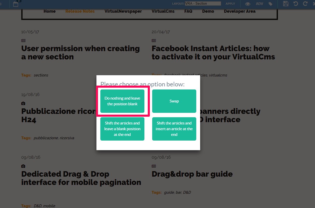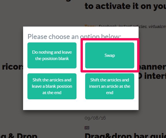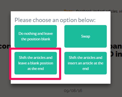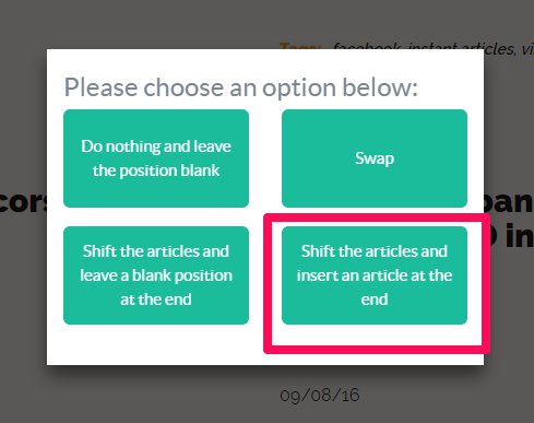 It shift the article flow on the contrary in the page (from bottom to the top) and open an additional overlay that suggests the closest content to be placed in the last position. You can also manually search for content. This is the result: