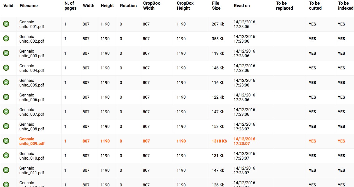 Quando appare l'elenco di tutte le pagine disponibili è possibile che alcune pagine appaiano di colore rosso. Questo non deve destare preoccupazione, il sistema mette in evidenza la pagina per far presente che supera il megabyte di dimensione e che quindi potrebbe richiedere più tempo in fase di process dell'edizione.
