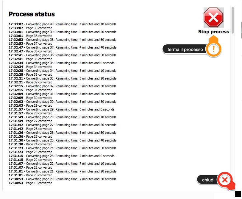 Il sistema mostrerà una finestra con l'andamento del process in cui saranno indicate: