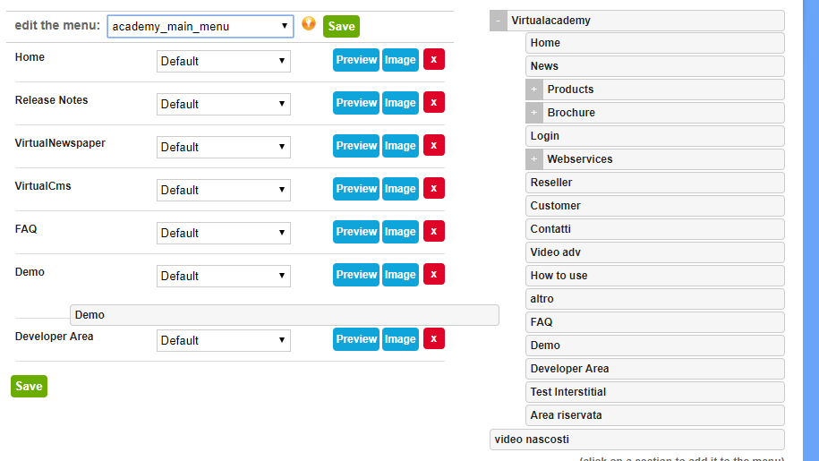Il modulo è suddiviso in due parti. Nella prima parte ci sono i menu con le proprie sezioni mentre nella seconda c'è l'elenco di tutte le sezioni del tuo sito.