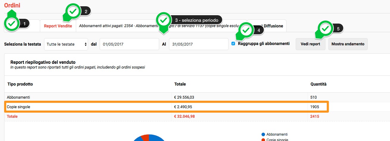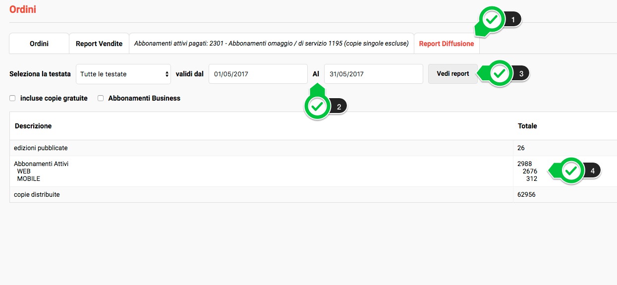eventualmente si possono anche selezionare i due flag "COPIE GRATUITE" ed "ABBONAMENTI BUSINESS" per aggiungere anche queste tipologie di copie al report.