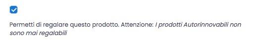 nel modulo PRODOTTI - configurazione prodotto, selezionare la casella "Permetti di regalare questo prodotto" Attenzione: I prodotti Autorinnovabili non sono mai regalabili"