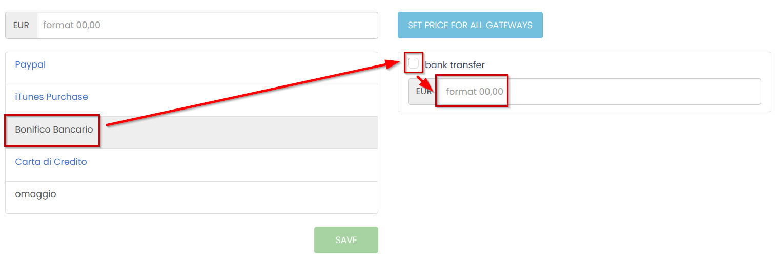 Once you are there you have to select the desired payment method, click on the checkbox to activate it and then set the price (see screenshot below).