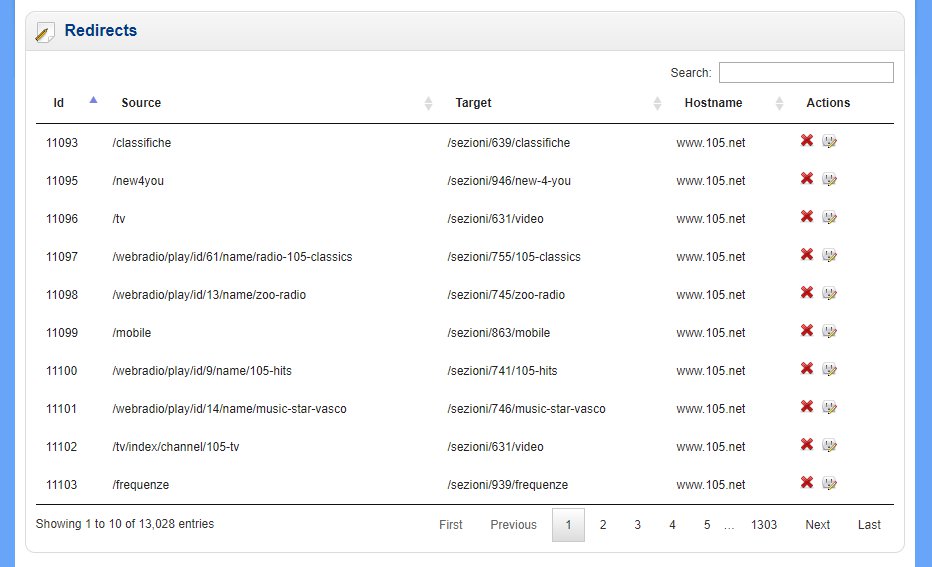 Quando si apre il seguente modulo, si può vedere la lista di tutti i redirect già inseriti: