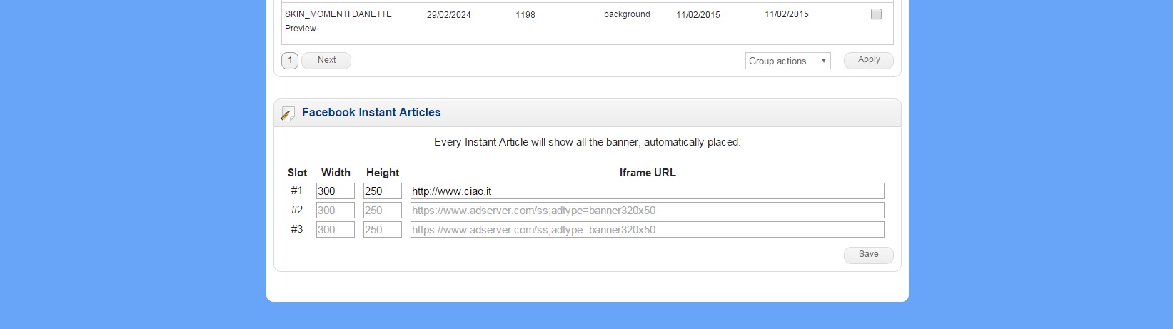 Fill the form's fields to refer to the banner iframe that you would like to show, and press Save. You can provided from zero (no banner will be showed) to three banners (all the banner positions will be showed).
