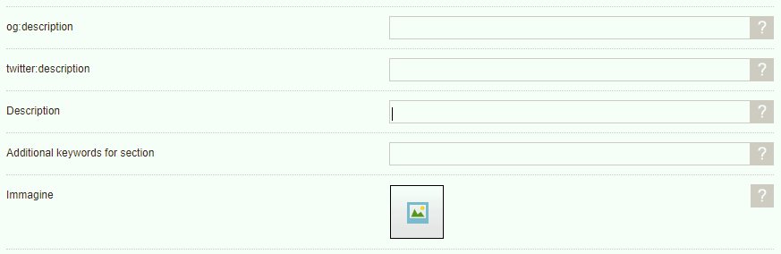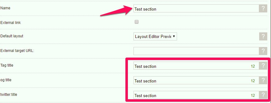 Name: You should enter the section name. When you fill the name field, the "Tag Title", "og: title" and "twitter: title" fields are self-compiled like the field name. Obvious you can edit them after enter the name field.