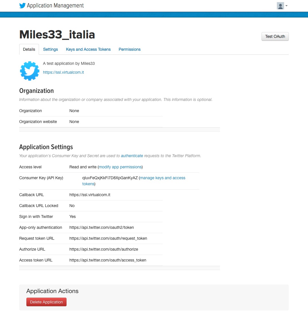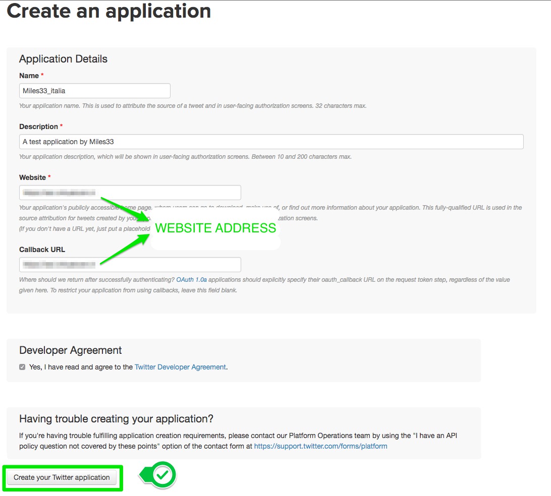 3. Fill the fields as in the following form and than "Create your Twitter application".
