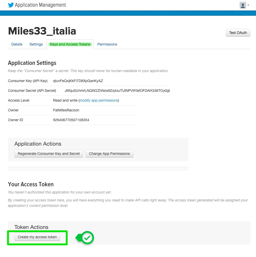 6. Press "keys and Access Tokens" and then "Create my access token"