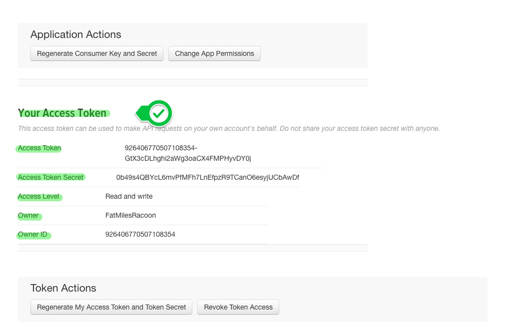 7. By clicking on the last button the page will be refreshed and you'll see a new paragraph called "Your Access Token" below which you will find the information required for the cms social connector to connect to twitter.