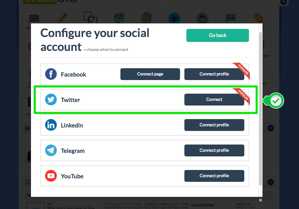 2. Choose Twitter (if you have other accounts connected before you must click "add" at the top right of the iframe)
