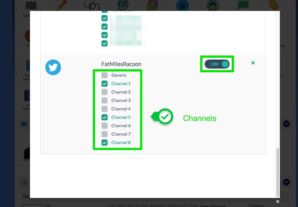 5. Now switch the account to "ON" and enable it for every channel you need by selecting the checkboxes.