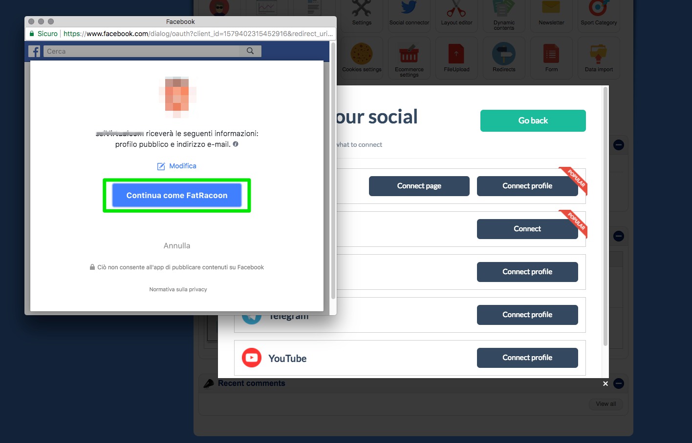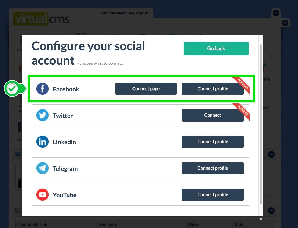 5. Now open the "Social Connector" Module and choose Facebook (if you have other accounts connected before you must click "add" at the top right of the pop-up)