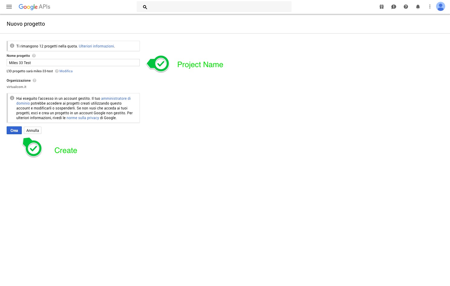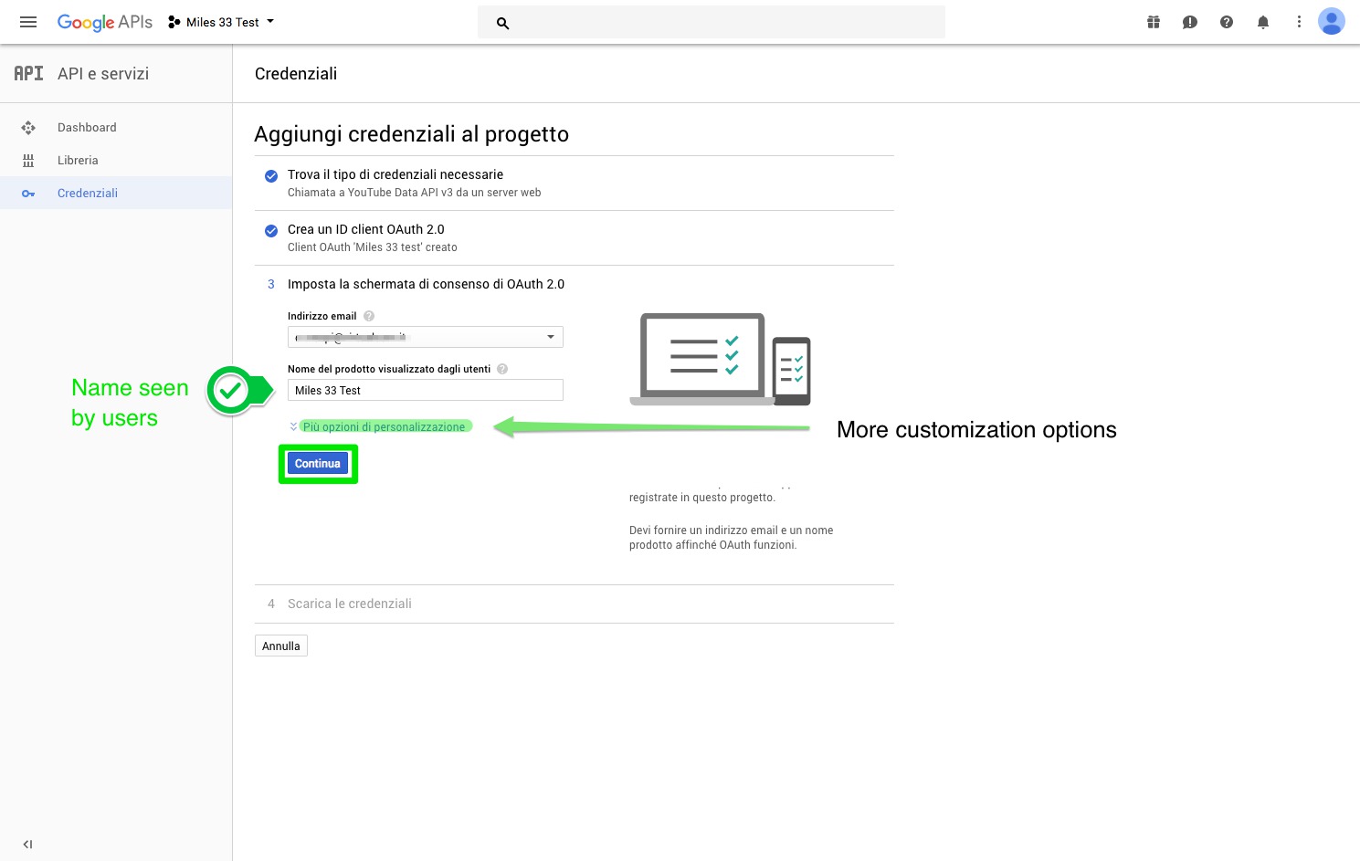 13. Third step of the creation of the Project credentials: in the second field add the name that will be seen by the users.