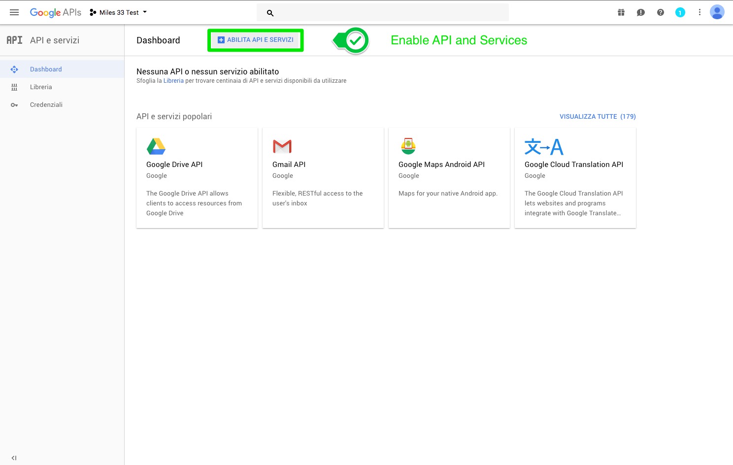 7. Now you can enable the API access by clicking on the lable "Enable API and Services"