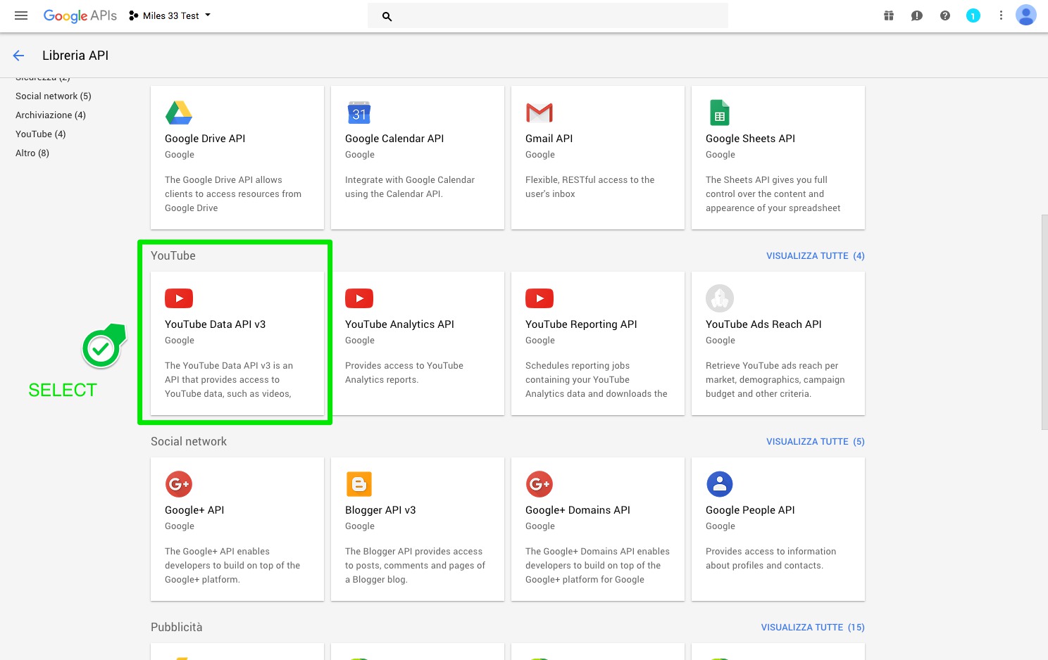 Scroll down and select "YouTube Data API"