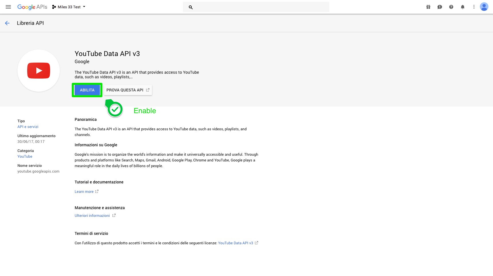 9. In the "Youtube Data API" page select "Enable".