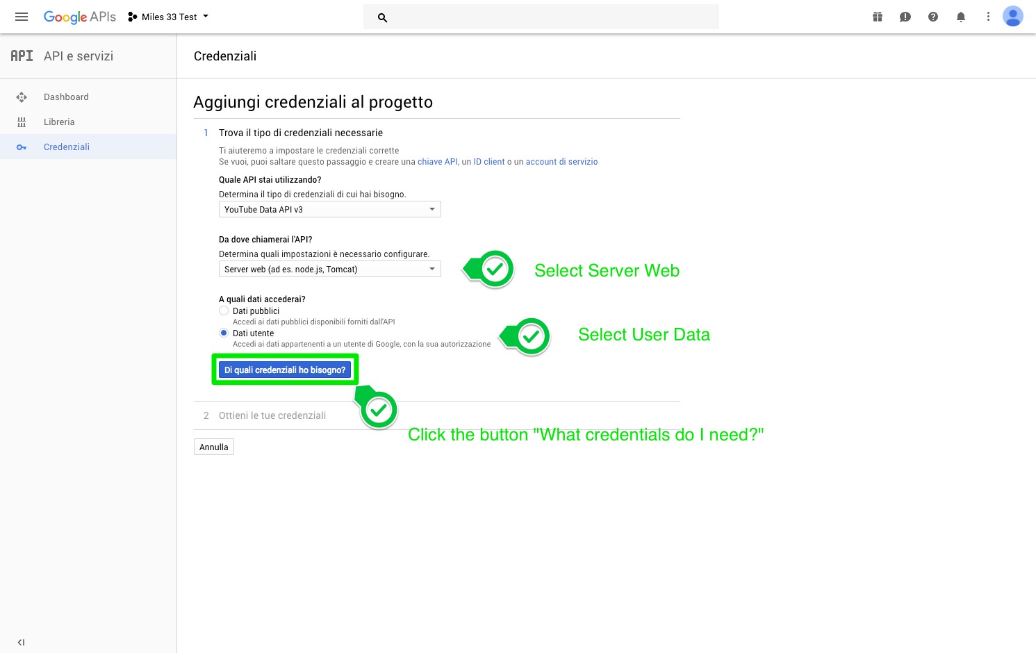 11. Select "Server Web" in the select asking from where you will call the API and "User data" radio button where you are asked which data you will acces.