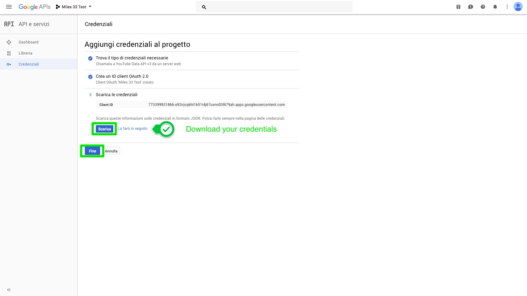 15. Remember to download the file (Json) which contains credentials by clicking on "download" blue button.