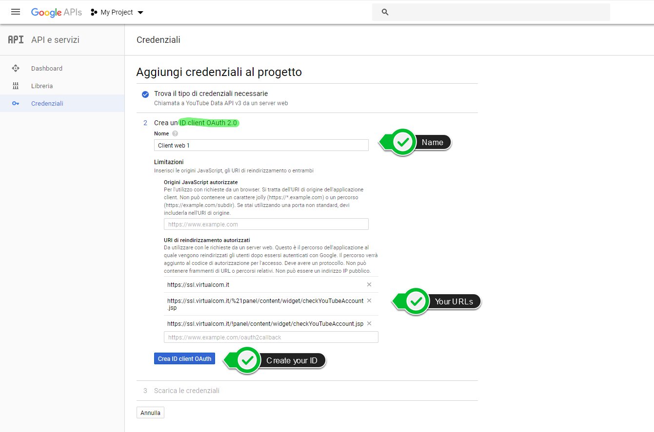 12. Now you need to create the OAuth credentials for the project: insert a name in the first field and copy and paste your URL in the 3rd.