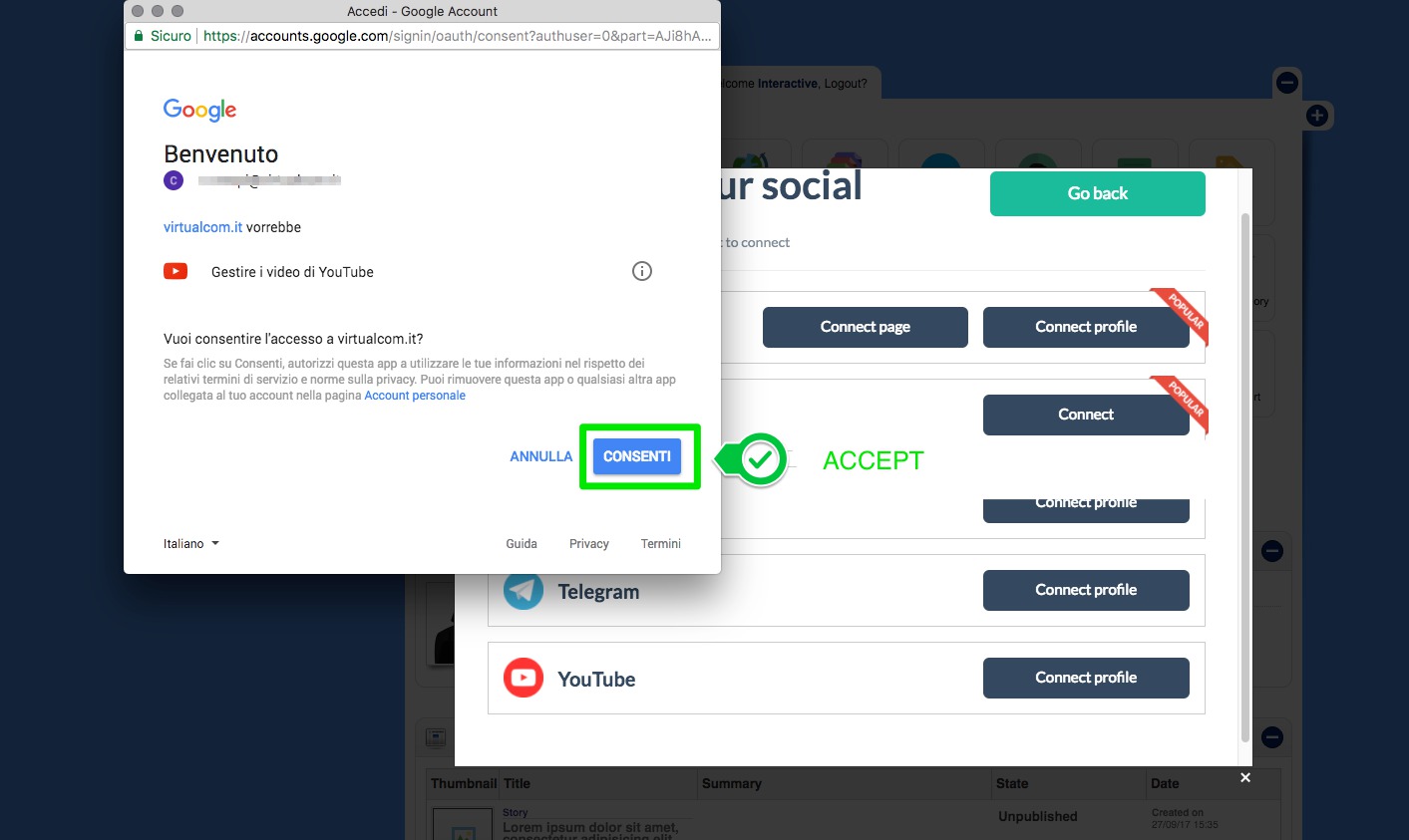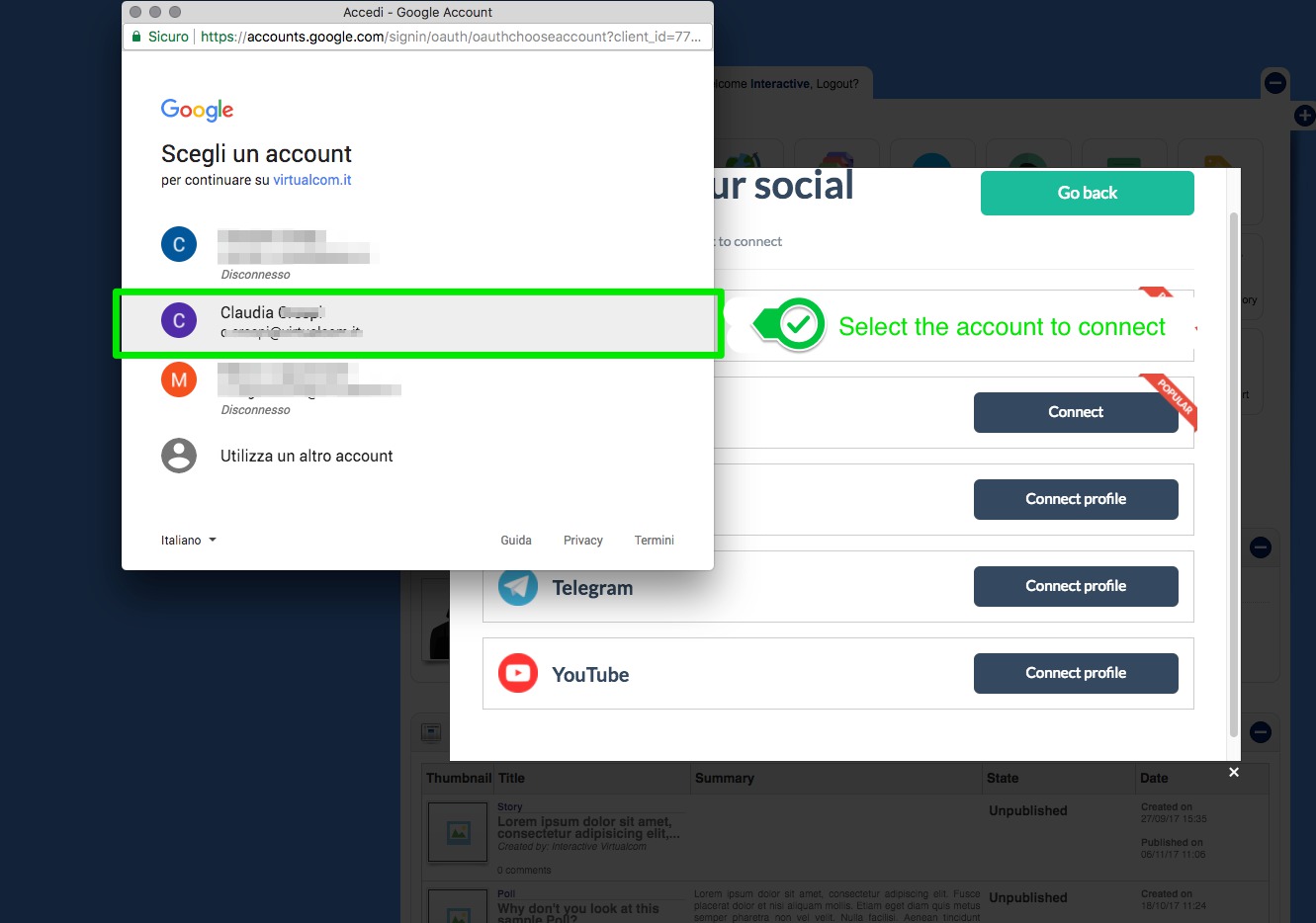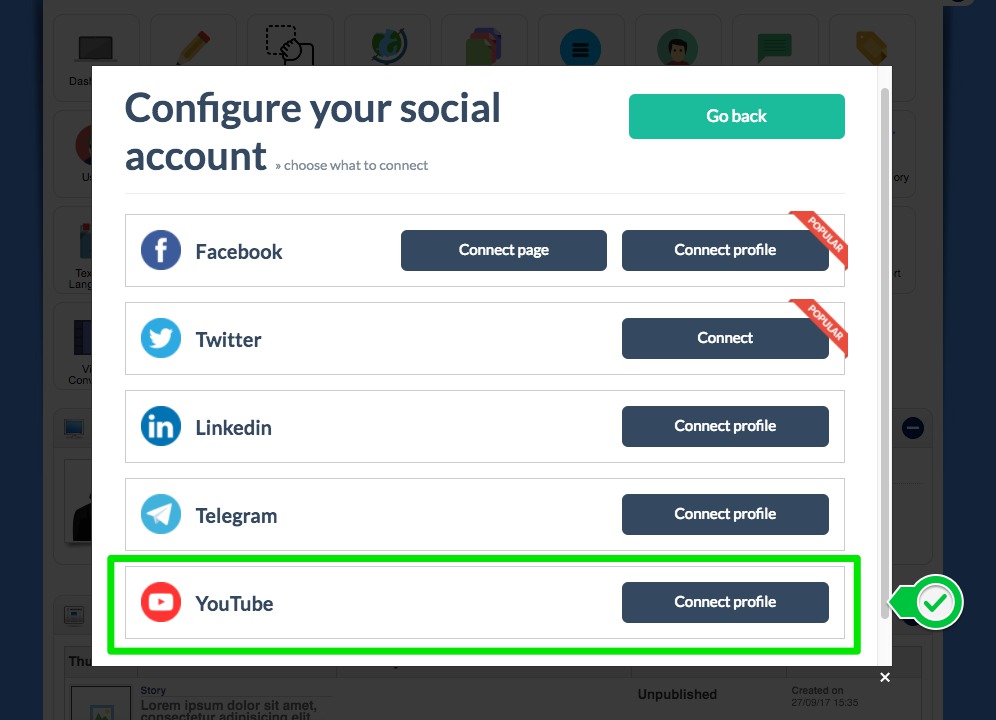 2. Choose Youtube (if you have other accounts connected before you must click "add" at the top right of the iframe)