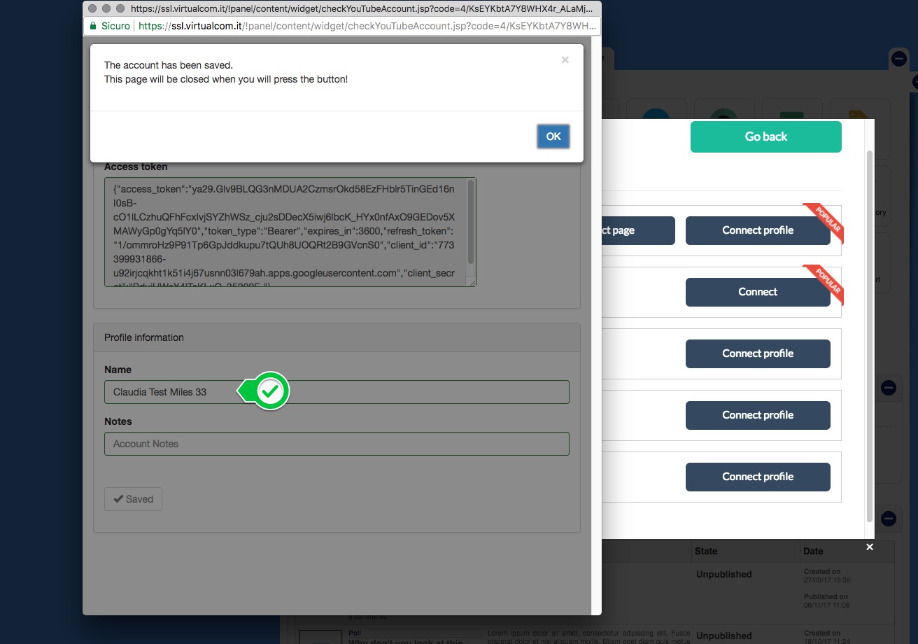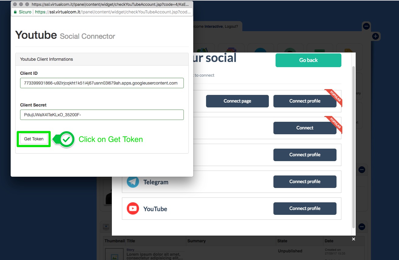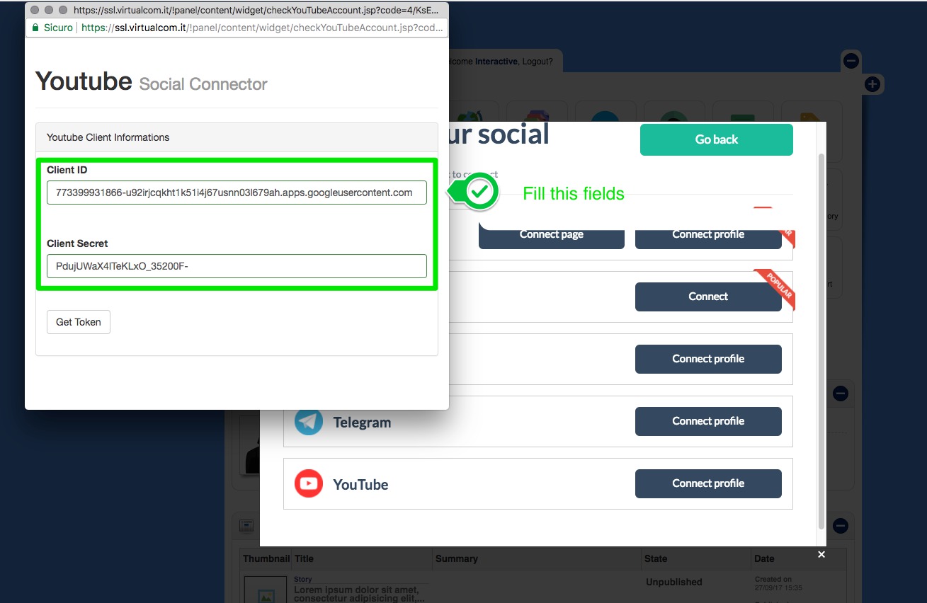 - Fill the fields with "client ID" and "client secret". You can find these values in the Json file downloaded or on your Google developer console.