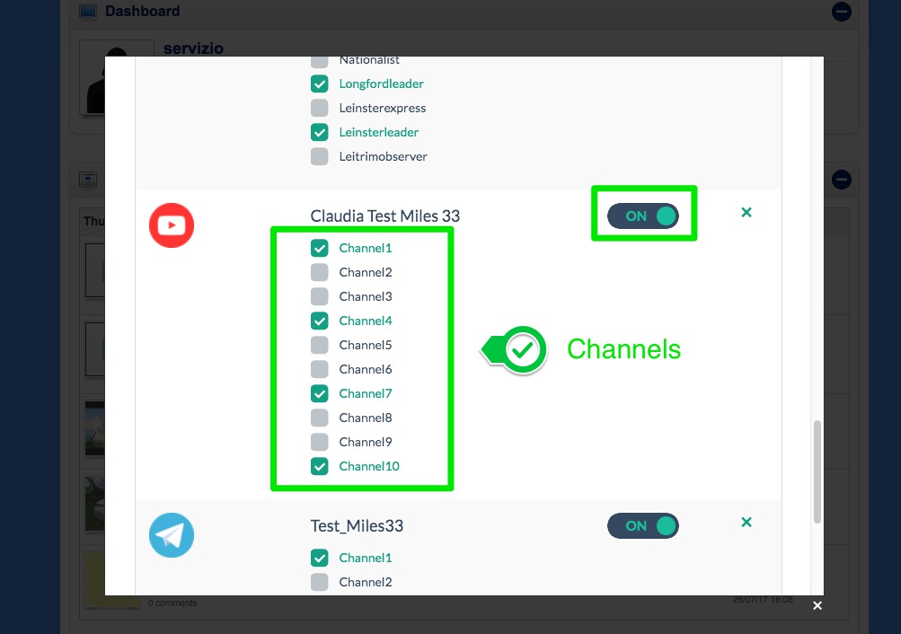 8. Now switch the account to "ON" and enable it for every channel you need by selecting the checkboxes.