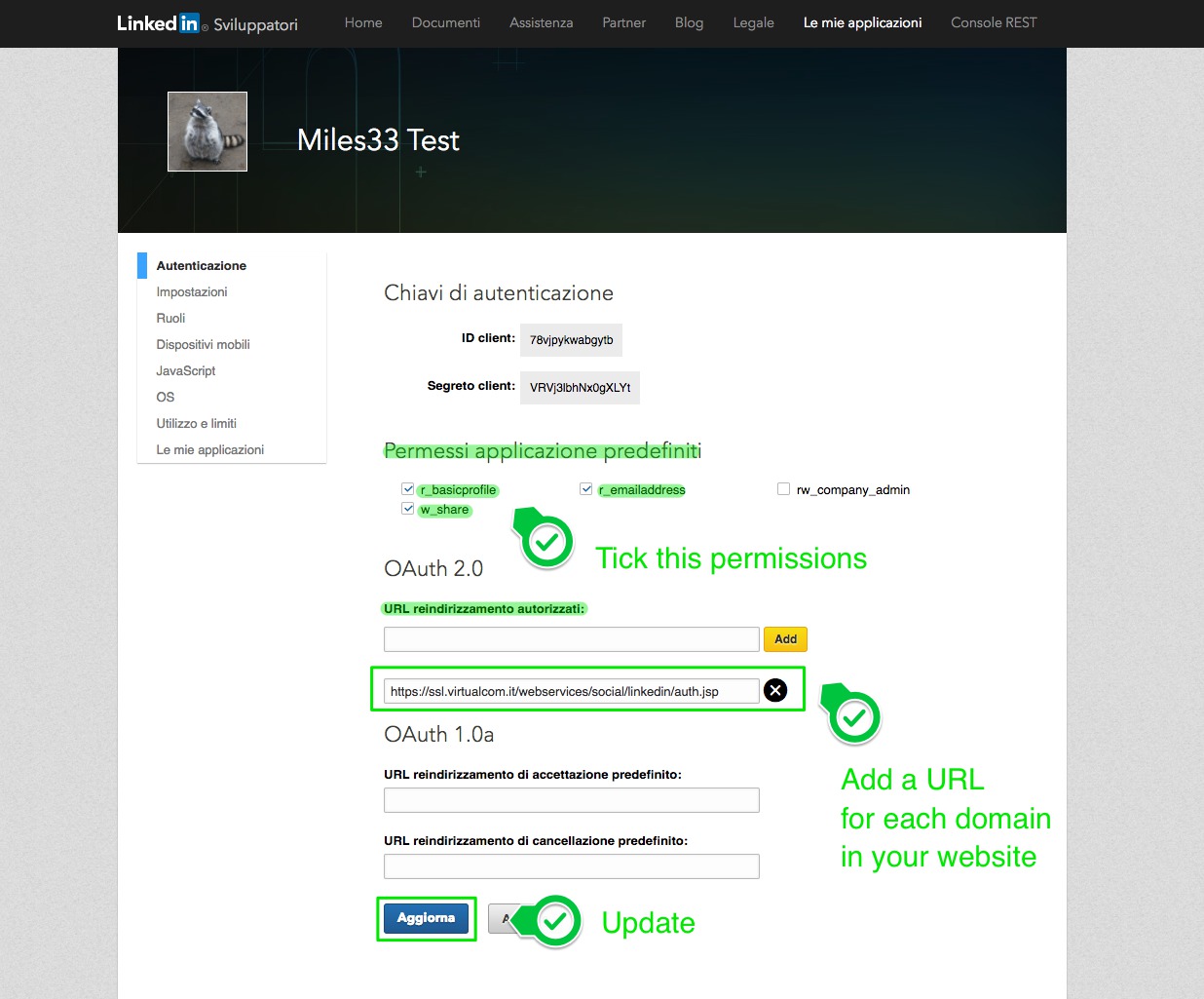- In the "Authorized Redirect URLs" field you have to add, for each domain of your website, the link https://ssl.virtualcom.it/webservices/social/linkedin/auth.jsp