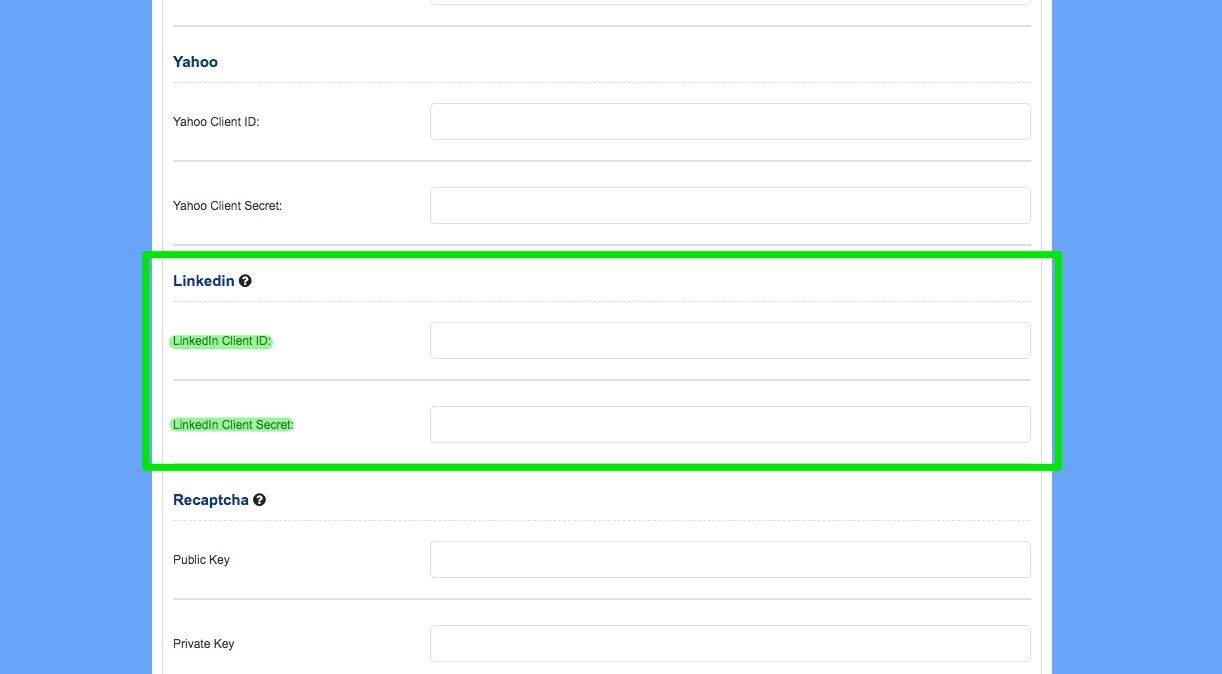 3. Look under "LinkedIn" label and fill the fields with the LinkedIn informations you copied before: "Client ID", "Client Secret"