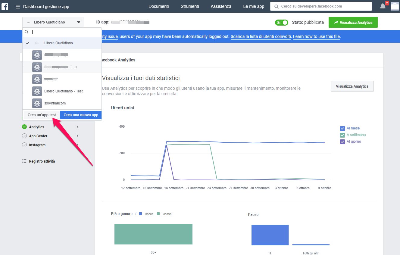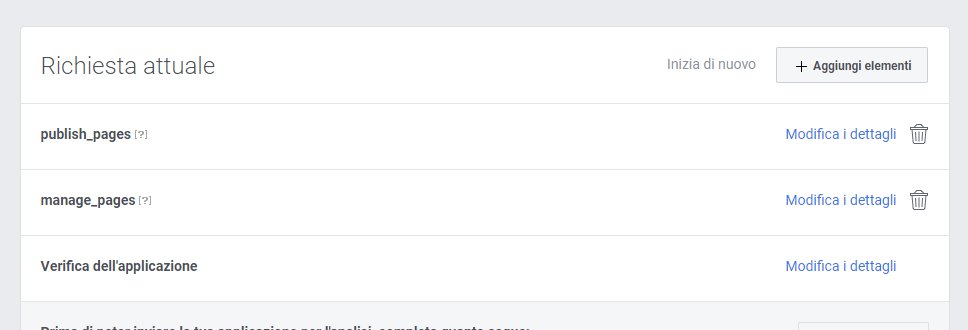 Dopo che si è configurata l'app di test, è necessario tornare sulla propria app ufficiale di Facebook per richiedere i permessi.