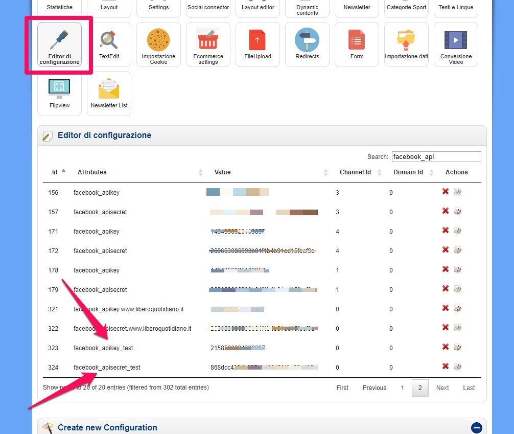 - Aprire il pannello del proprio sito, aprire il modulo "Editor di Configurazione" e inserire se non sono già presenti i seguenti attributi: