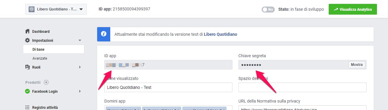- Attributes: facebook_apisecret_test --> Value: Inserire la chiave segreta