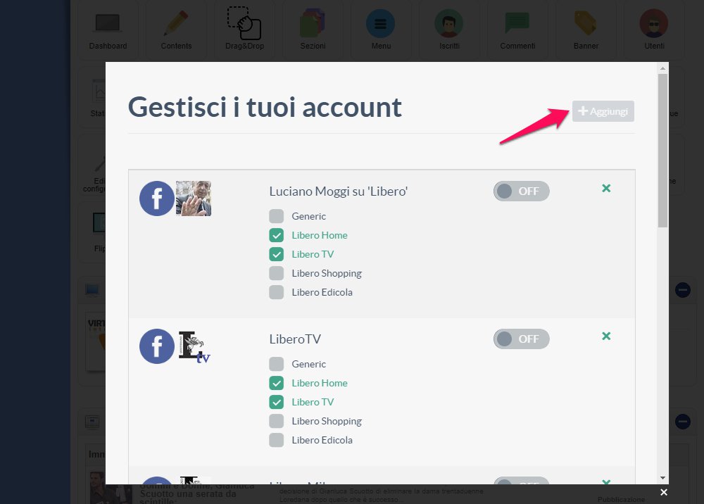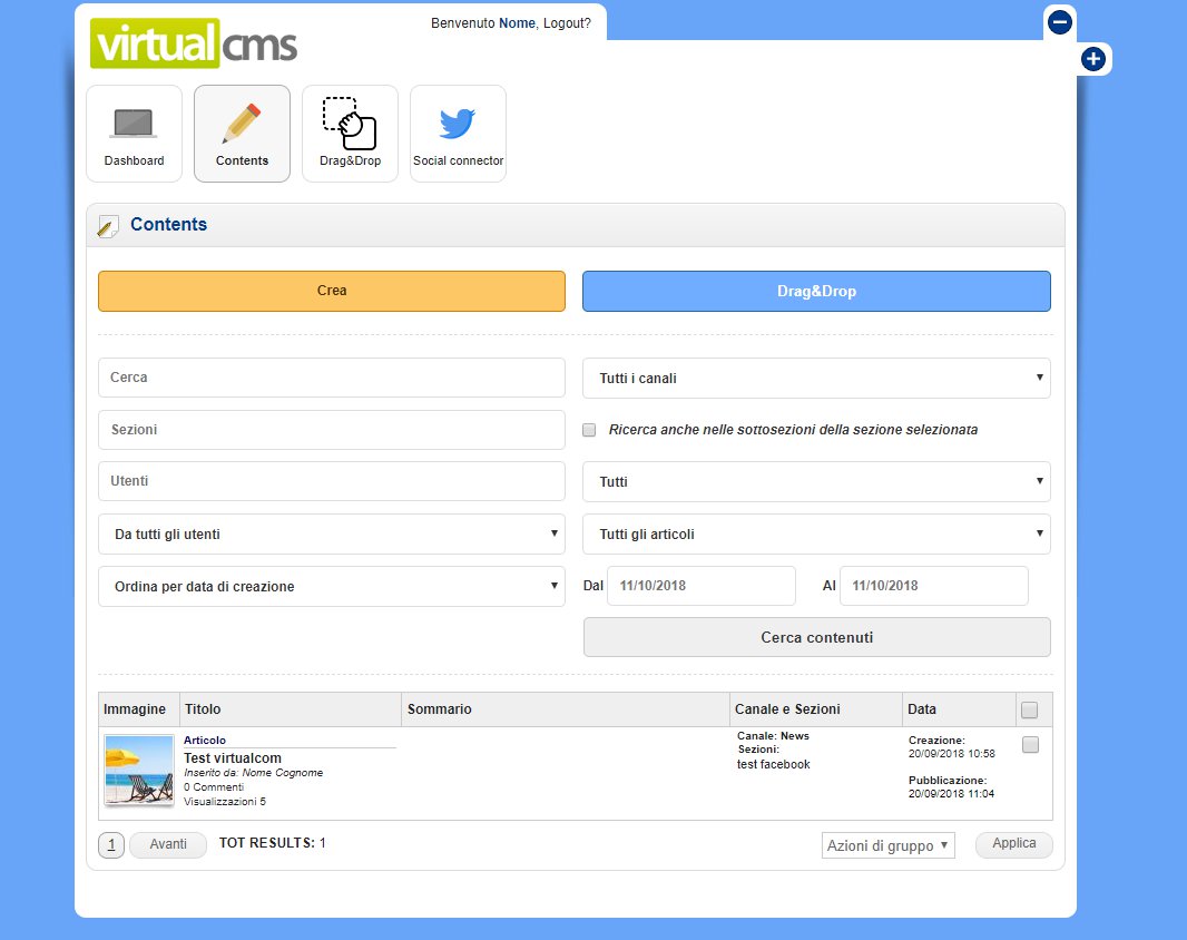 - Collegarsi nel pannello con l'utente appena creato, creare un articolo e pubblicarlo nella sezione "Test Facebook"