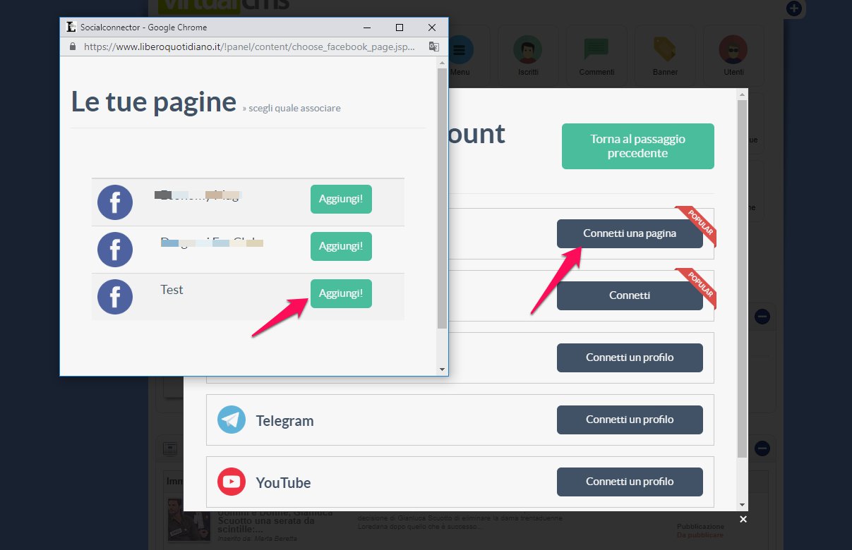 - Creare su facebook una Pagina di Test (per poter pubblicare post di test, attraverso il social connector) e collegarla nel cms nel modulo del social connector: