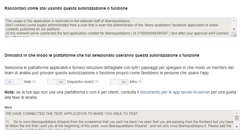 The usage of this application is restricted to the editorial staff of Nomequotidiano. We'll connect some pages administrated from a user that is even the administrator of the 'Nome quotidiano' facebook application to share contents published on our platform. At this moment we've connected the test application created for Nomequotidiano ( id 28****[inserire id App di test] ) and after your approval we'll connect the official app.