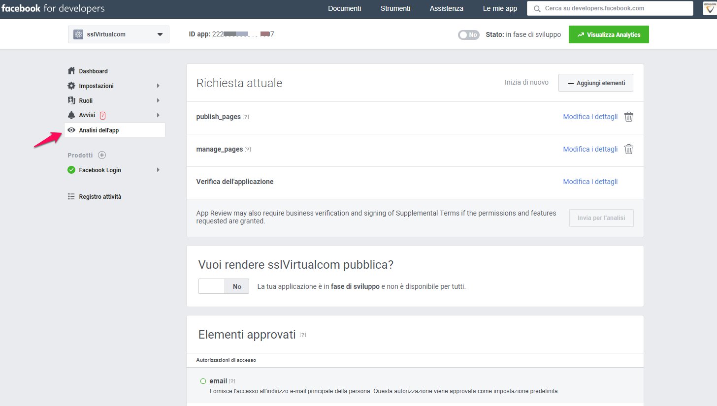 le operazioni da compiere per approvare l'app di Facebook sono le seguenti: