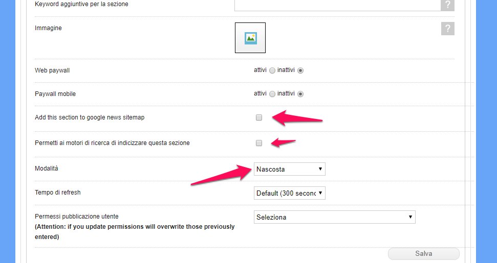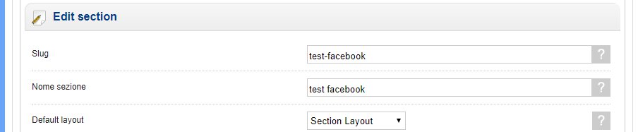 - Nel modulo Sezioni, creare una nuova sezione "test facebook", disabilitare le spunte per l'indicizzazione ed impostare la modalità "Nascosta"