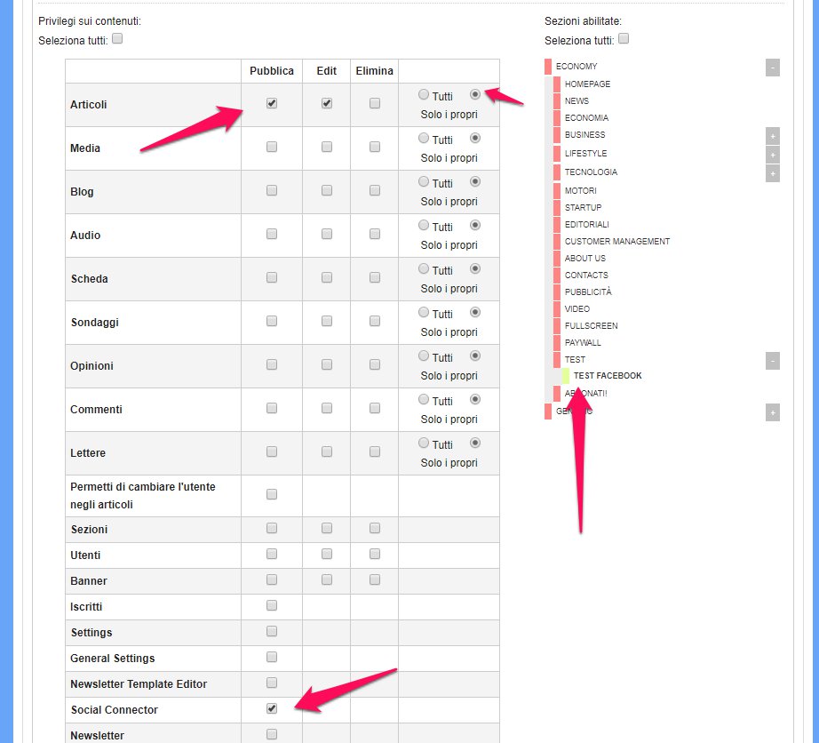 - Creare un nuovo utente di pannello nel modulo Utenti. Utilizzando l'elenco delle sezioni sulla destra, abilitare la sezione "Facebook test" precedentemente creato. Invece, nell'elenco dei permessi sulla sinistra, abilitare all'utente di creare e pubblicare solo i propri articoli; in più, abilitare il permesso di visualizzare il modulo Social connector