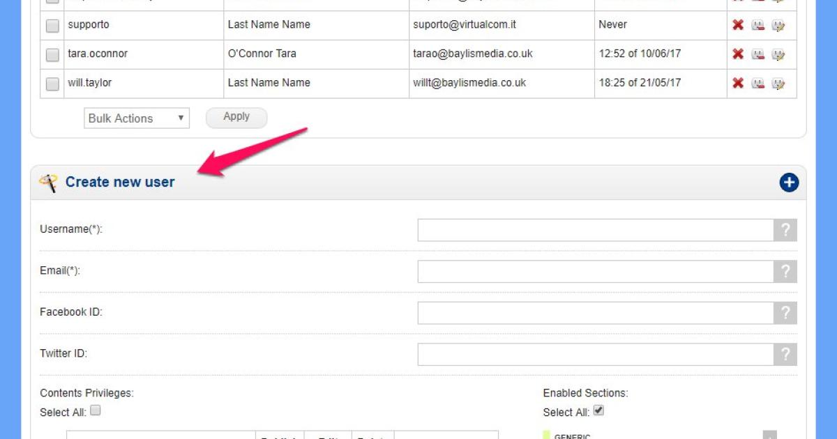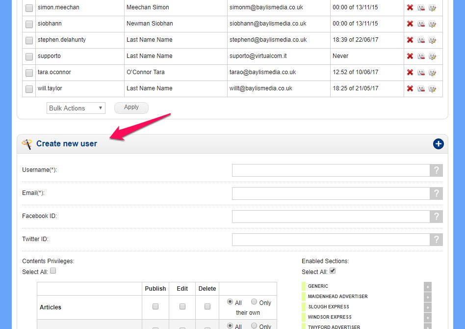 For create a new User you need to go to the end of the page where you find the form named "Create a new user".