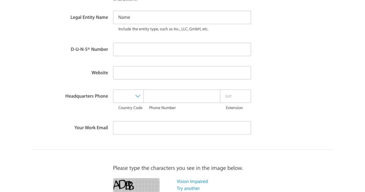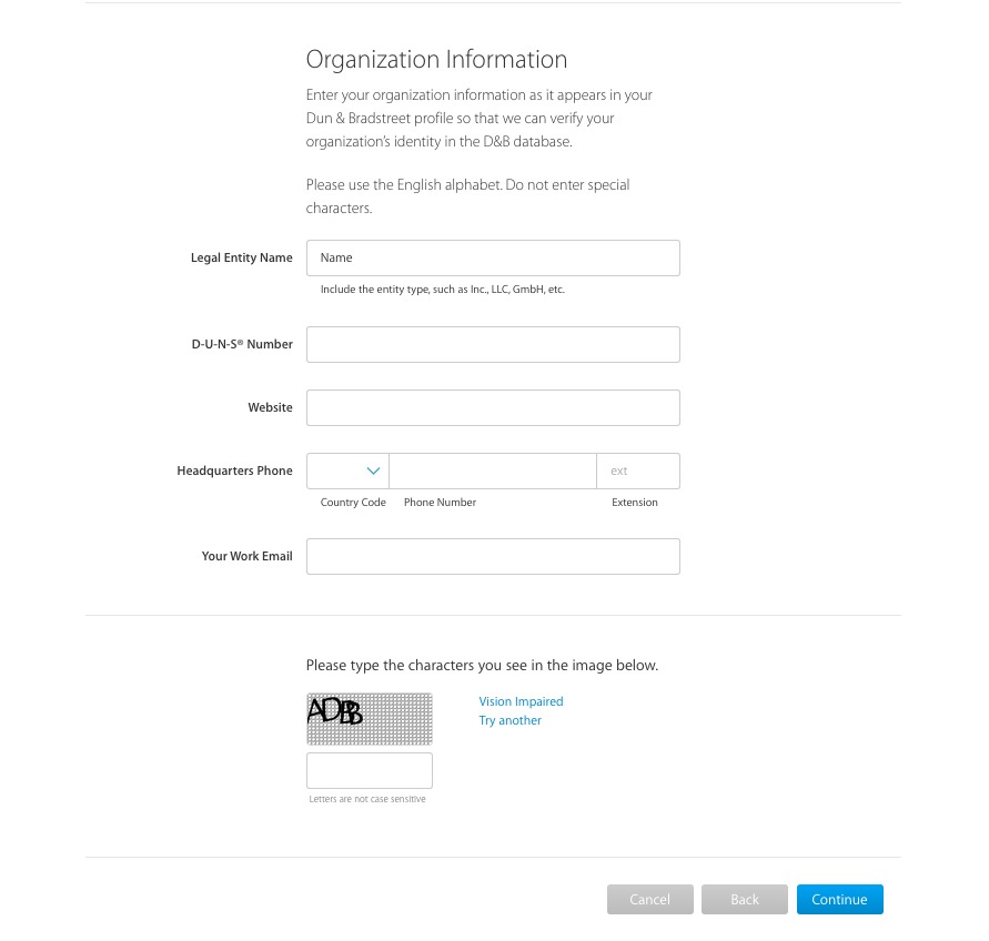 Your organization must be a legal entity to so that it can enter into contracts with Apple. We do not accept DBAs, Fictitious Businesses, Trade names, or branches.