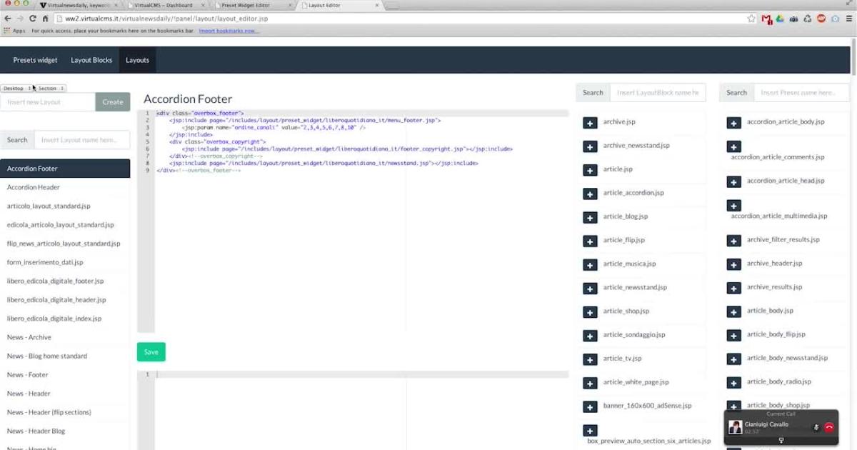 Now, from the right column we can add as many “layouts blocks" as we want. For example, we can add the header block just clicking on the “plus” button. The block will be automatically added in position. Then, clicking on the “pencil” icon we can enter inside the layout block and edit it. Going back to the layout, now it’s time to add the content widgets, for example the article "preview full" widget and its stylesheet in the textarea below.Save.Now let's repeat the operation and add three “article medium preview” widgets in the top textarea and link their css into the second one.Save again.I will copy and paste, for example, the other css inclusions from an other layout.Save.Now we are ready to create a section from the panel using our brand new layout. From “create section” we can choose the name of it and apply the “section standard test” layout.Save.Finally it's the moment to see in the front end how our new section’s layout looks like.We can see the elements that we added from the layout editor interface: header, footer, one article preview full, and two article previews medium.let's suppose that we want to edit again and add something more to this layout, we just need to enter again in the interface and click, for example the “box preview auto slider”.Then, as we did before, link its css stylesheet. If we go back to the front end, we will see the new box preview auto slider just below the medium previews. .Now you are ready to create or edit as many layouts as you want.